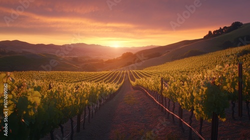 Naklejka premium Serene Sunset Over Lush Vineyard Landscape