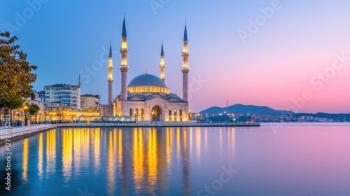 Fototapeta premium Serene Sunset Over Mosque Reflections at a Vibrant Waterfront
