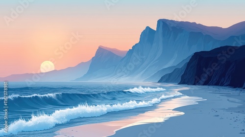 Fototapeta premium Serene sunset over ocean cliffs and beach.