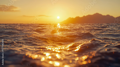 © Daria, Fototapeta premium Serene sunset over ocean waves with distant mountains