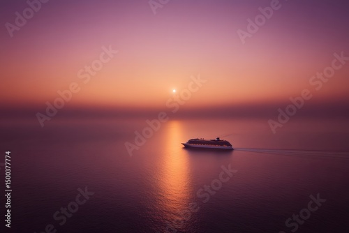 © n.img, Naklejka premium Serene Sunset Over Ocean With Cruise Ship Sailing in Tranquil Waters