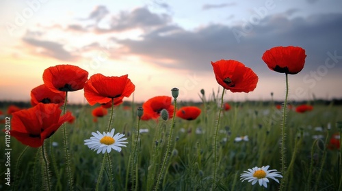 Fototapeta premium Serene Sunset Over Poppy Field with Daisy Blossoms