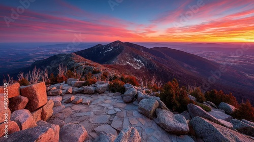 © Supawadee, Obraz premium Serene Sunset Over Rocky Highlands During Warm Haze in the Evening Sky