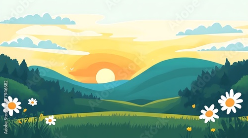 © Bagong, Fototapeta premium Serene Sunset Over Rolling Green Hills And Daisies