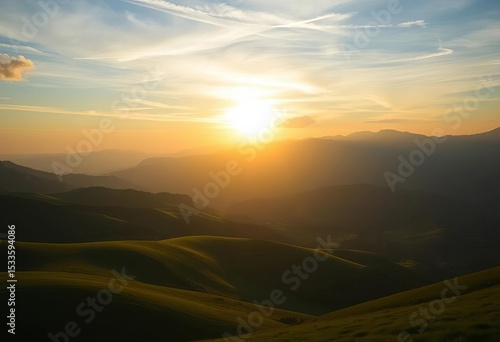 Obraz premium Serene sunset over rolling green hills and majestic mountains, warm sunlight...