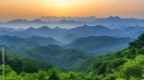 © Cah, Fototapeta premium Serene Sunset Over Rolling Green Mountains