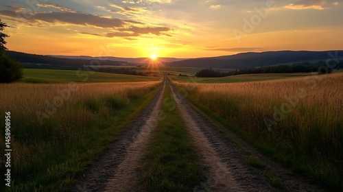 Naklejka premium Serene sunset over rolling hills, a dirt road leads towards the golden sun,...