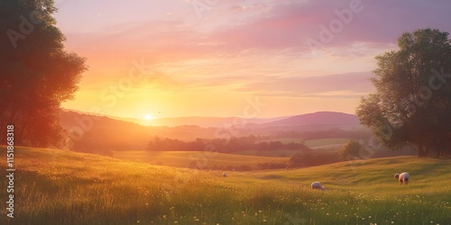 © Marius, Obraz premium Serene Sunset Over Rolling Hills with Sheep Grazing in Fields