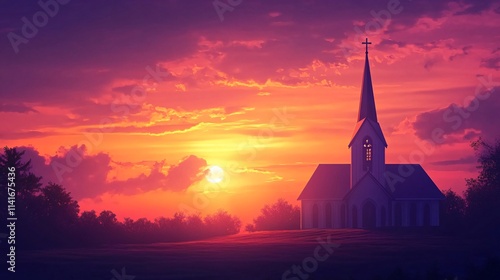 © worapong kan-asa, Fototapeta premium Serene Sunset Over Rustic Chapel Surrounded by Peaceful Landscape