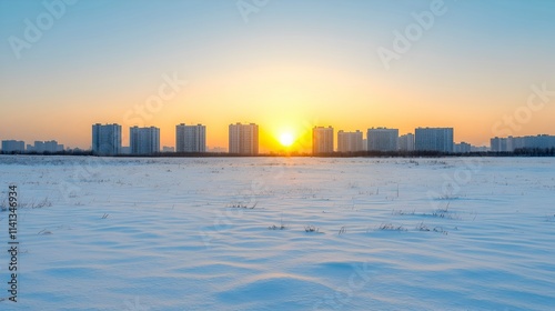 © Teerapat, Fototapeta premium Serene Sunset Over Snowy Urban Landscape