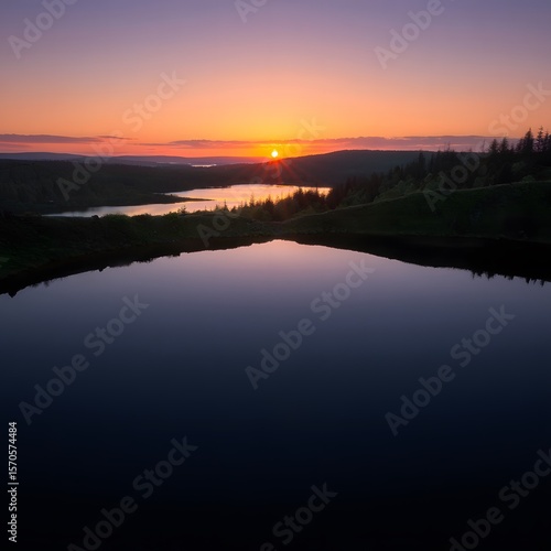 Fototapeta premium Serene Sunset Over Still Lake and Forest, Peaceful Twilight Landscape...
