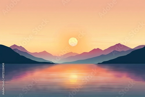 Naklejka premium Serene sunset over the sea with mountains, a minimalist flat vector...