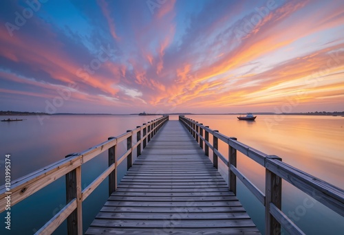 © Mehdi, Fototapeta premium Serene Sunset Over The Water. Long Pier Stretches Towards The Horizon. Peace And Tranquility. Soft Blue Orange Hues. A Scenic Representation Of Natural Beauty. Boat In The Distance.