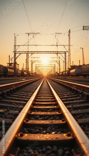 © Kitta Studio, Fototapeta premium Serene Sunset Over Train Tracks with Glowing Horizon and Silhouettes
