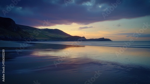 Obraz premium Serene sunset over tranquil beach with hills and calm ocean reflecting colors.