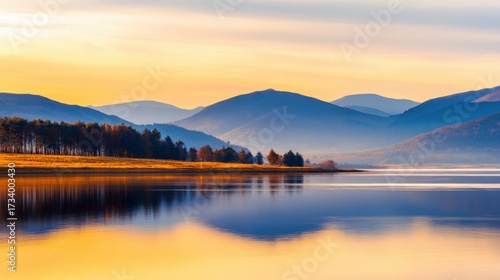 Fototapeta premium Serene sunset over tranquil lake surrounded by mountains and trees,...