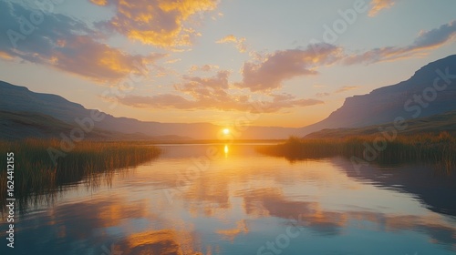 © Fye, Fototapeta premium Serene sunset over tranquil lake with mountains reflected (2)