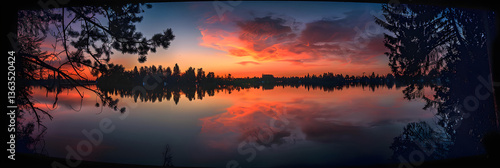 © Matilda, Fototapeta premium Serene Sunset over Tranquil Lake with Vibrant Sky and Reflective Waters Framed by Silhouetted Trees