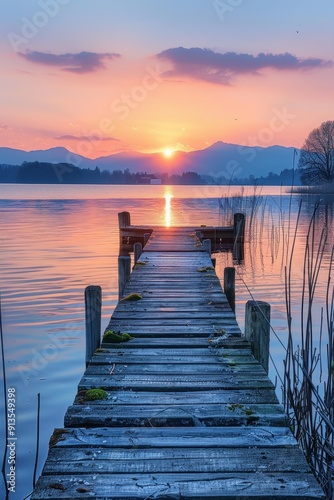 © Sunshine, Fototapeta premium Serene Sunset Over Tranquil Lake with Wooden Pier and Mountainous Horizon