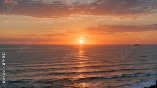 Naklejka premium Serene Sunset Over Tranquil Ocean Waves with Warm Golden Reflections Capturing a Beautiful Coastal Landscape at Dusk.