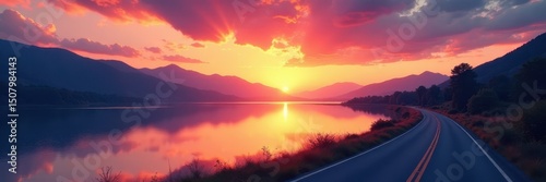 Obraz premium Serene sunset paints sky; calm lake reflects colors, road winds nearby ,...