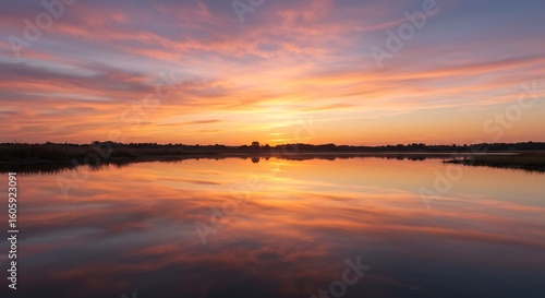 Fototapeta premium Serene sunset paints tranquil lake with warm hues reflecting softly. AI...