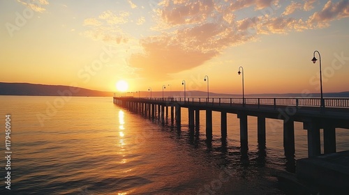 © sudari, Fototapeta premium Serene Sunset Pier: Golden Hour Landscape Photography