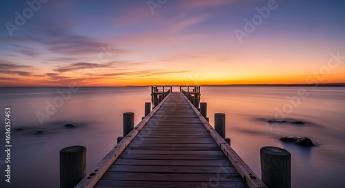© tukiran, Obraz premium Serene Sunset Pier with Ocean View.