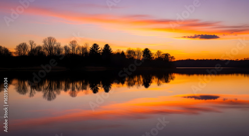© danie, Fototapeta premium Serene sunset reflecting on a calm lake, silhouetted trees line the shore.