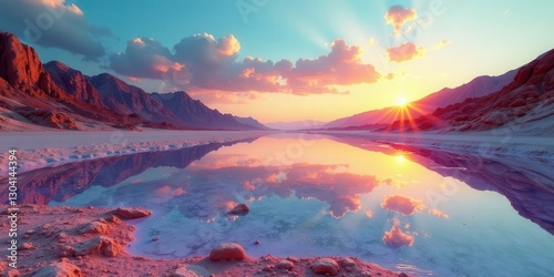 © Angel Pic, Fototapeta premium Serene Sunset Reflection in a Pink Desert Lake, Mountains Silhouetted Against a Vivid Sky