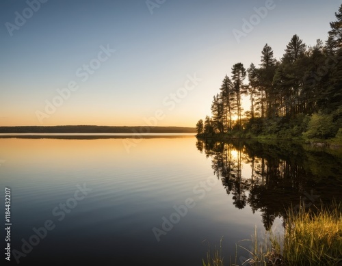 Fototapeta premium Serene Sunset Reflection on Calm Lake with Silhouetted Pine Trees