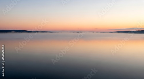 © Jas, Fototapeta premium Serene Sunset Reflection on Calm Water with Distant Land.