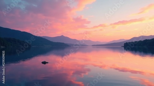 © Jiraporn, Fototapeta premium Serene Sunset Reflection on Still Lake Waters, Surrounded by Majestic Mountains at Dusk