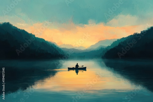 © SunPunjiStudio, Fototapeta premium Serene Sunset Reflection Over Calm Lake with Kayak in Mountains