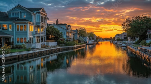 © Matcha_09, Fototapeta premium Serene Sunset Reflection Over Calm Waterway