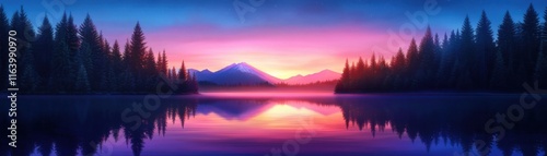 © Chanita, Naklejka premium Serene sunset reflection over tranquil lake majestic mountains digital art nature wide angle peaceful escape