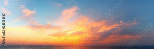 © zhuan, Obraz premium Serene Sunset Sky Calm Horizon Soft Pastel Colors Orange Pink Deep Blue Illuminated Clouds
