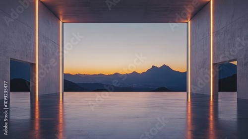 Fototapeta premium Serene sunset view from a minimalist concrete structure. The warm sunset colors contrast beautifully with the cool gray of the building. A perfect blend of architecture and nature.