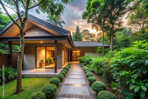 © Urenus Photos, Fototapeta premium Serene Sunset Vista Modern Architectural Design with Lush Landscaping and Stone Pathway