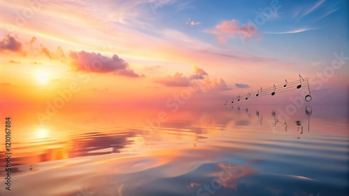 Fototapeta premium Serene Sunset Waters Reflecting a Melody of Musical Notes on a Calm Ocean at...