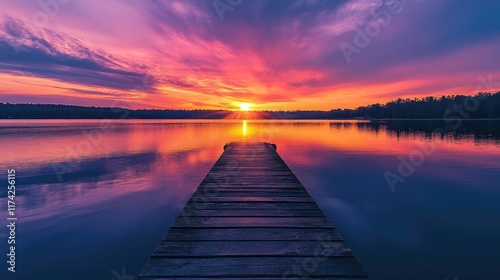 Fototapeta premium Serene sunset with vibrant colors reflecting on calm water at a wooden dock creating a peaceful atmosphere for relaxation and contemplation