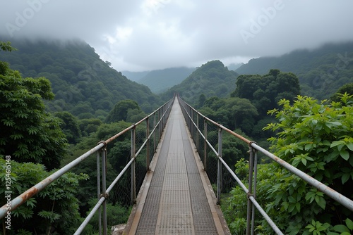 © SR Creative Idea, Obraz premium Serene Suspension Bridge Pathway Over Lush Green Mountain Valley Landscape