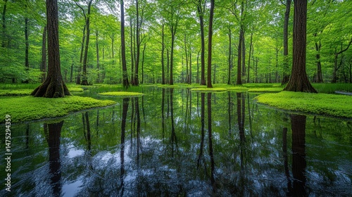 © ROY, Fototapeta premium Serene swamp forest reflected in still water. Lush green trees line a tranquil marsh