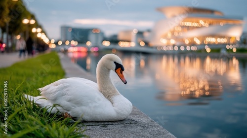 © Boonyawadee.K, Obraz premium Serene Swan by the City Lights
