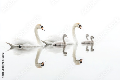 Fototapeta premium 4 Serene swan family swimming together in a still lake with each birds...