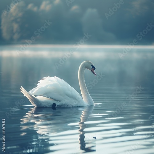 © Thares2020, Fototapeta premium Serene Swan Gliding on Tranquil Lake Graceful Wildlife Portrait Capturing Peaceful Atmosphere