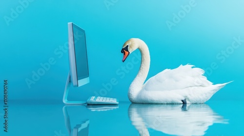 © AiAbstract, Obraz premium Serene Swan Using Computer Mouse with Blue Background