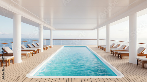 © Marketplace, Fototapeta premium Serene swimming pool area with loungers, overlooking a tranquil ocean view. Modern architectural design enhances relaxation and leisure for vacationers seeking tranquility.