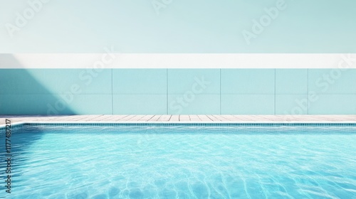 Fototapeta premium Serene Swimming Pool with Crystal Clear Water and Large Aqua Blue Empty Wall Space for Text in a Bright Modern Setting