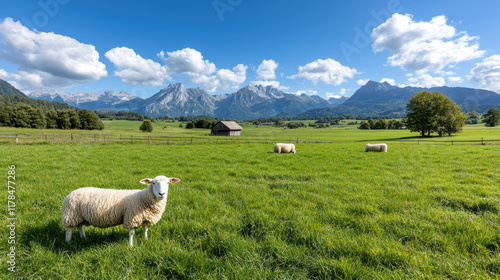 Fototapeta premium serene Swiss farm with sheep grazing in lush green fields and mountains